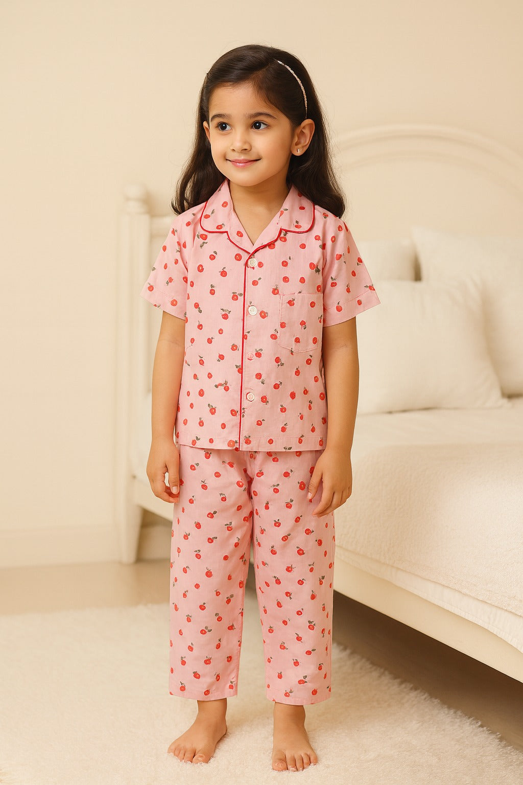 This girls' night dress features a charming cherry print and a comfy fit with short sleeves and a shirt collar. Perfect for a cozy and stylish night's sleep.