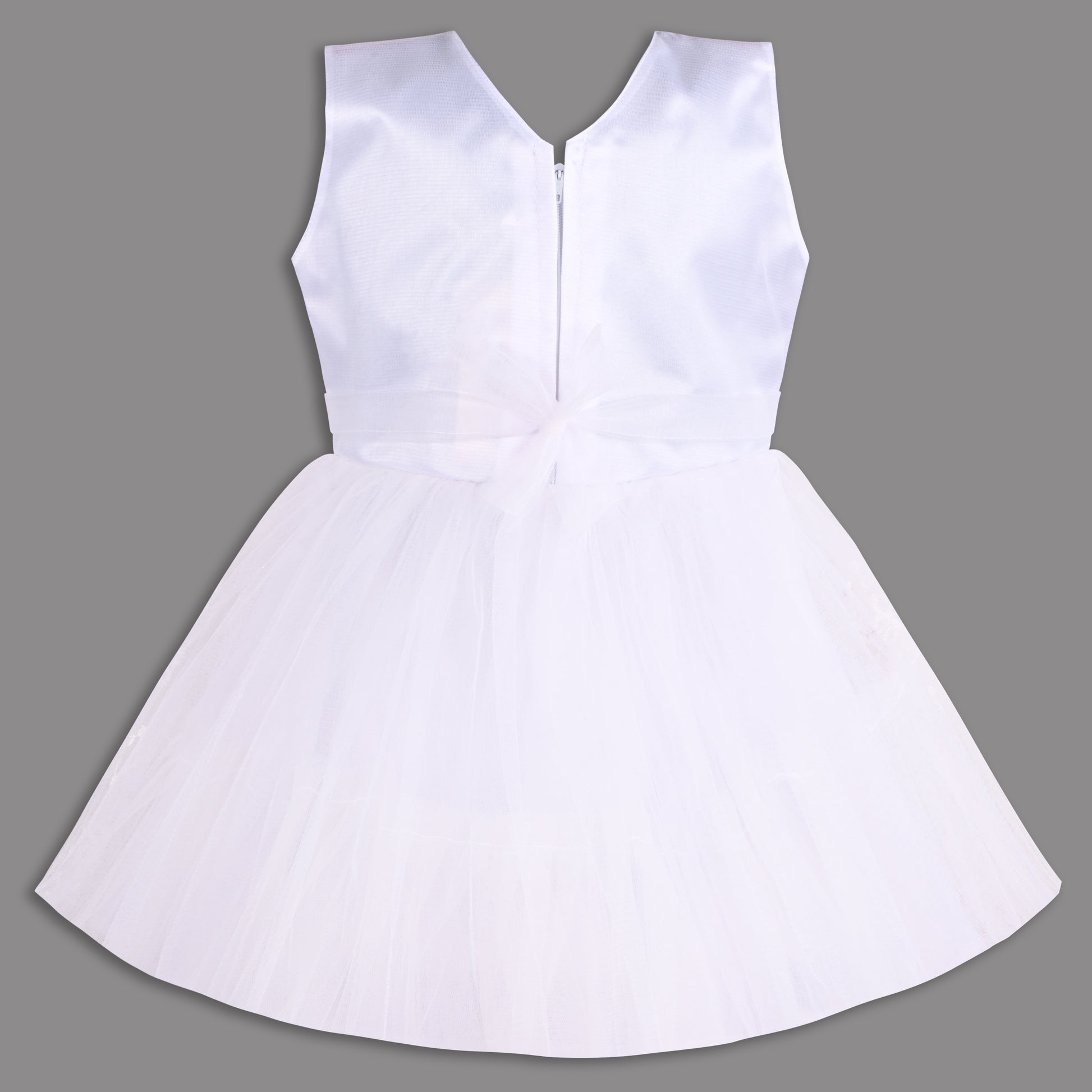 The white lace net skirt features exquisite embroidered floral patterns and blue bead embellishments, giving the outfit a fairytale-like look. The sparkling waistband adds a hint of glam, ensuring a perfect fit and style. Lightweight and breathable, this sleeveless dress is ideal for birthdays, weddings, and festive celebrations — combining comfort with a regal finish.