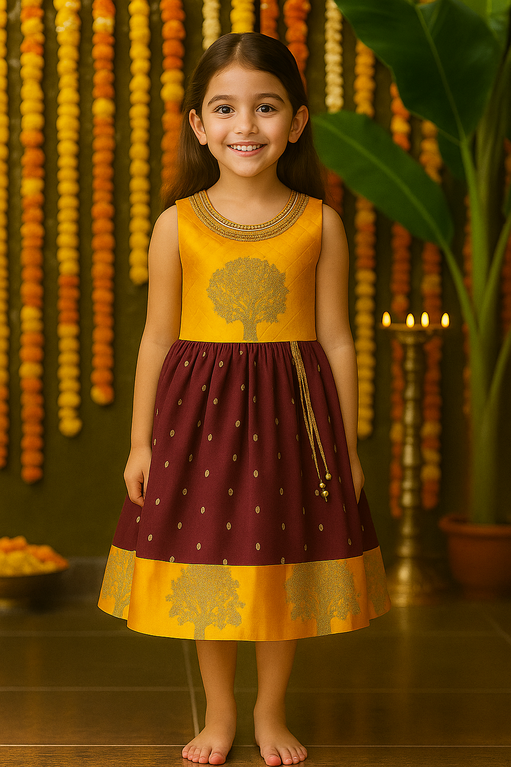 This girls' flared ethnic dress is crafted from satin silk fabric, featuring beautiful ethnic zari embroidery with a flared pattern and a waist tie-up for perfect fit, perfect for festive occasions, weddings, or celebrations. Its soft and smooth texture with a soft cotton lining ensures all-day comfort while giving a traditional yet stylish charm.