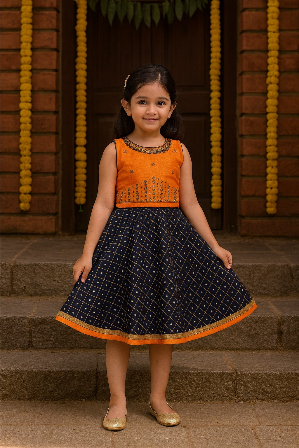 Dress her in timeless elegance with this Baby Girl Navratri Dress – a bead embellished printed silk ethnic outfit that beautifully blends traditional charm with festive flair. Made from rich silk fabric, it features an intricate all-over print and delicate bead embellishments that enhance its celebratory look. Soft, comfortable, and gracefully designed, it’s perfect for Navratri, weddings, festivals, or special family events. The ethnic cut ensures a flattering fit, while the thoughtful detailing makes it a standout piece in her festive wardrobe.